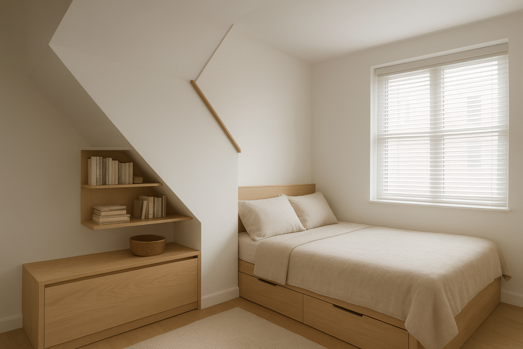 Dead Space is Transformed Into Something Useful by Space-Efficient Design A major advantage of space-efficient living is to take what are essentially dead spaces and turn them around so that they perform some function. Many times, you can utilize corners, space under the stairs or even under your bed to create storage or extra seating. There are custom Internum closets,’’ wall-mounted shelves, and even some vertical storage options so every square foot can sing. This controlled utilization of space is what makes small dwellings feel big and well-designed.